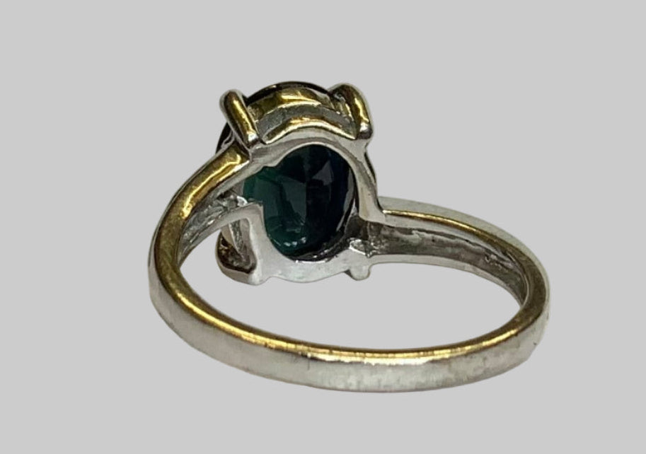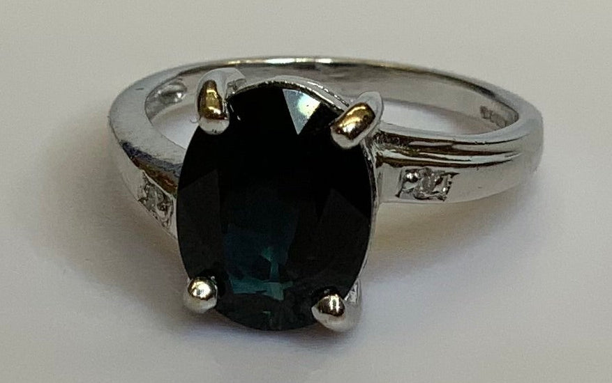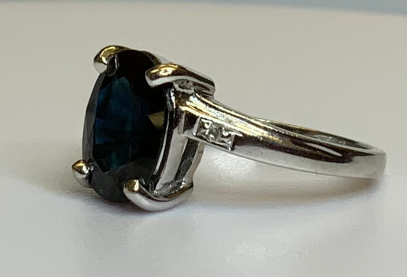 This striking 18ct white gold vintage ring features a large oval-cut deep blue sapphire measuring approximately 8.5mm x 11mm, accented by two small brilliant-cut diamonds set on the shoulders. The sapphire displays a rich, velvety blue tone with excellent depth of colour, beautifully contrasted by the bright white diamonds and polished white gold setting.