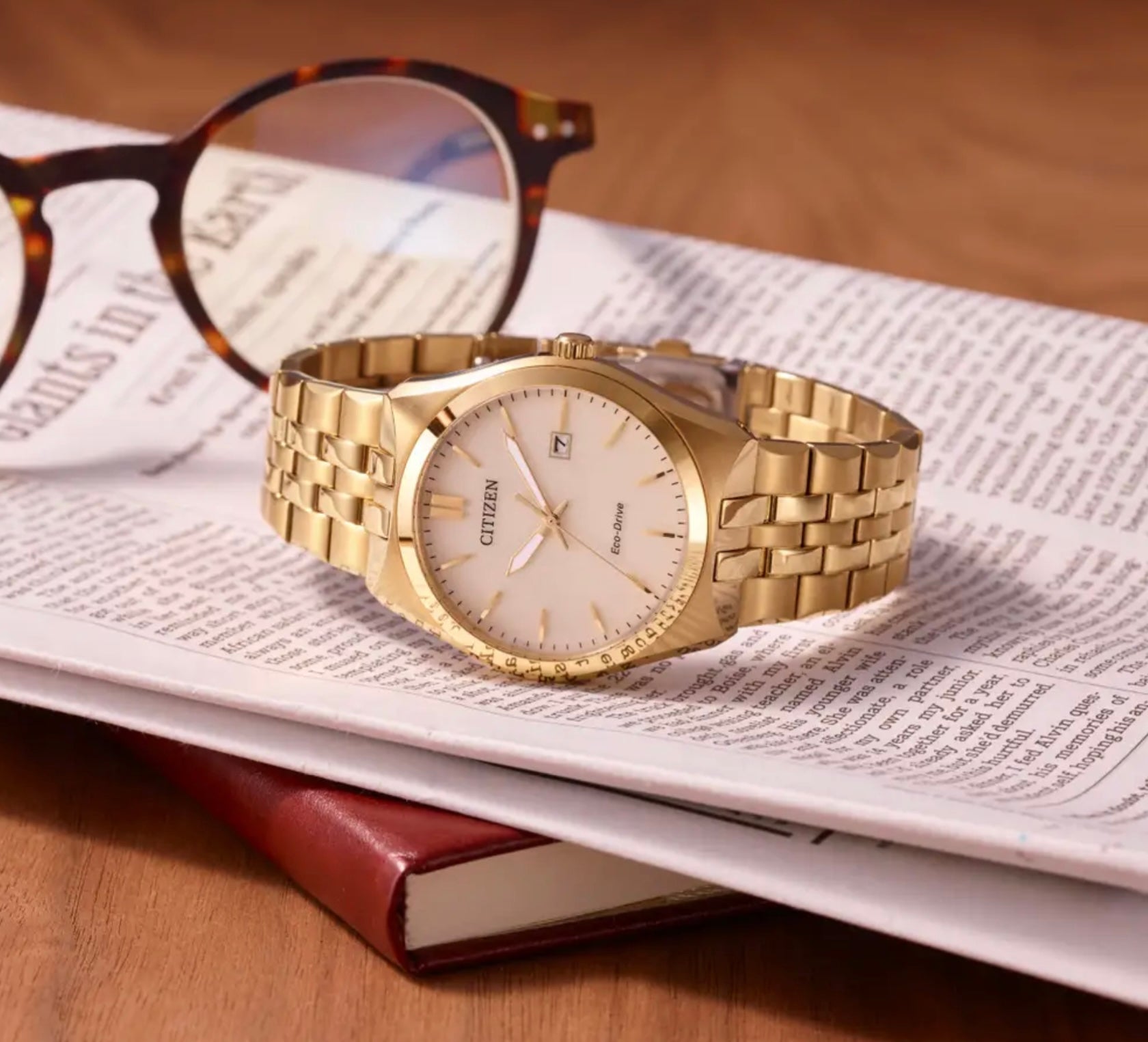A classic timepiece is always in style, this Men's Bracelet is a great choice for everyday wear. This elevated men’s watch is accentuated by a gold-tone stainless steel case with its eye-catching black three-hand dial with date. An integrated bracelet completes the look. This Eco-Drive watch is sustainably powered by any light source, eliminating the need for a battery, and is water resistant up to 100 metres
