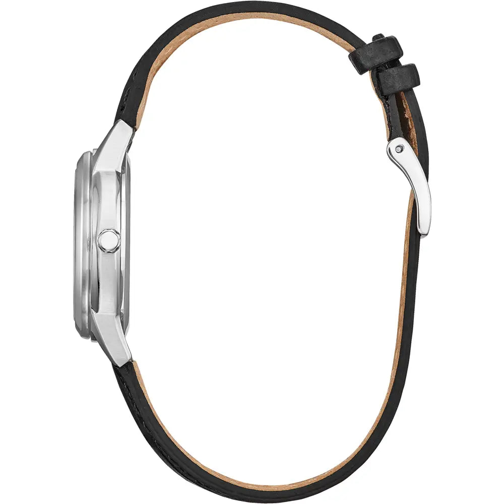 Timeless appeal that never goes out of style, this 30mm Ladies’ Strap timepiece is styled with a black leather strap, blue dial with date display and roman numerals at 12 and 6 o’clock. With Eco-Drive technology, this watch is sustainably powered by any light and never needs a battery.